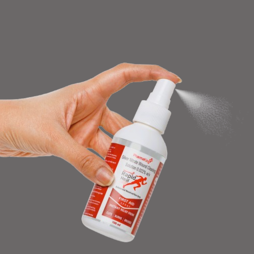 PharmaKing Rapid Heal Spray is a clear, odorless and transparent topical use spray containing Silver Nitrate. It is an antimicrobial Skin and Wound Cleanser intended for use under the supervision of a healthcare professional for the cleansing of foreign materials including micro-organisms from wounds such as stage I-IV pressure ulcers, diabetic foot ulcers, post-surgical wounds, first and second-degree burns, grafted and donor sites. It helps in the mechanical removal of debris and foreign material from the wound site. It is least toxic to the tissues, non – irritating & non-staining & soothes pain through its cooling effect. It contains active silver ions which are continuously released (140 ppm) and these are dispersed through the water base from nano to colloidal and micro particles.